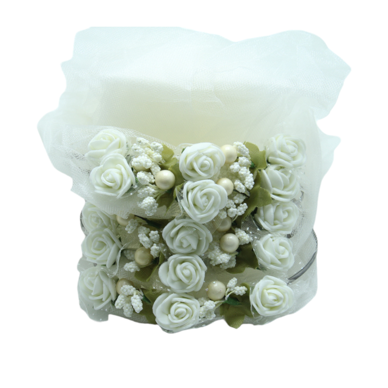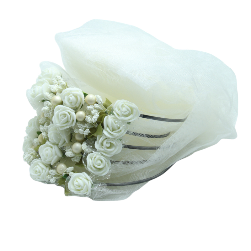 Brautjungfern Haarreifen Metallbügel mit weißem Tüll, weißem Gesteck und weißen Blumen